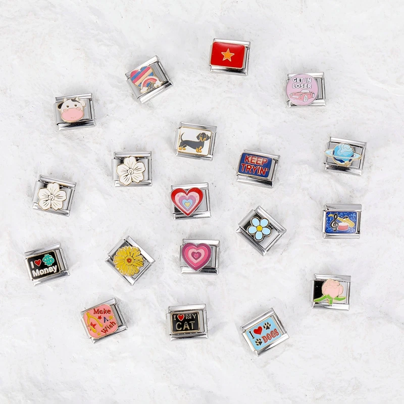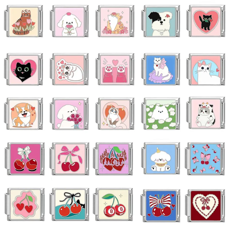 Cartoon Cute Cats Dogs Flowers Cherry Heart Italian Charm Links Fit 9mm Stainless Steel Bracelet Men Women DIY Making Jewelry